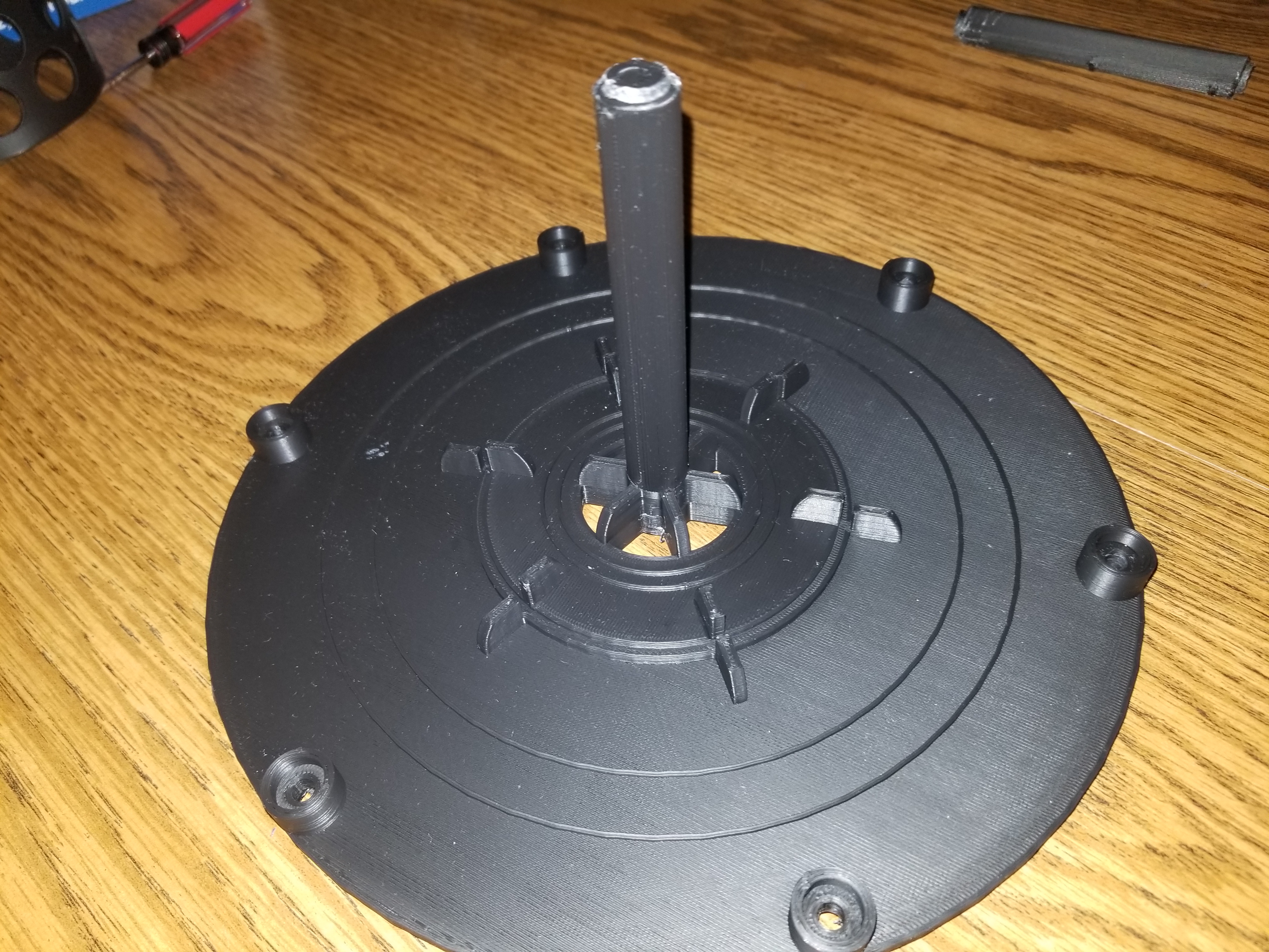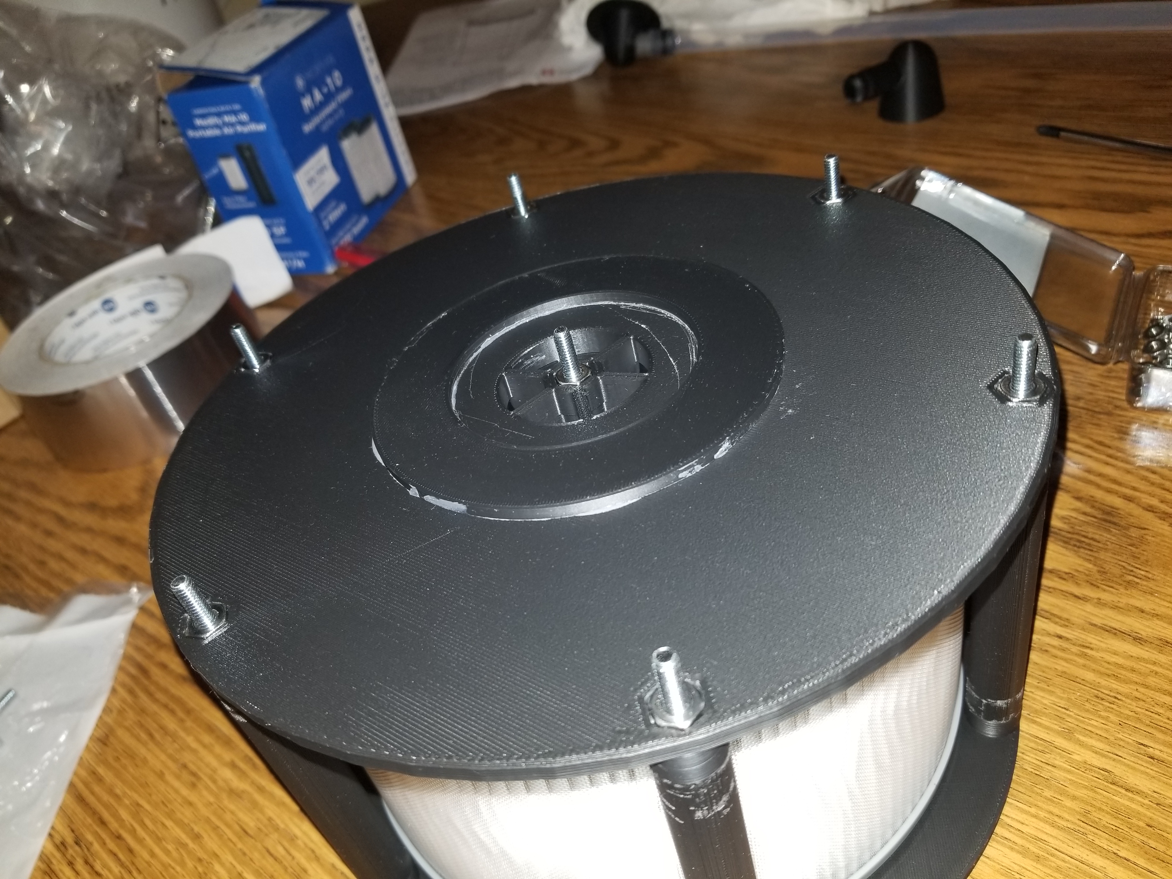 25 - 20250110_230415.jpg I inserted a 5 inch #8x32 screw through the center hole of the bottom of the fillterbox as shown. I then put the screew into the center support to align the top and bottom with the support and screw. I then lowered the bottom all of the way until it laid flat on the assembly. | ![]() |